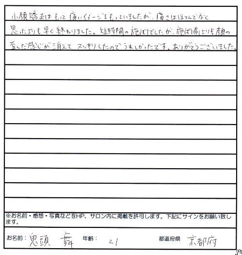 短時間の施術でしたが、施術前よりも顔の歪んだ感じが消えてスッキリしたのでうれしかったです。