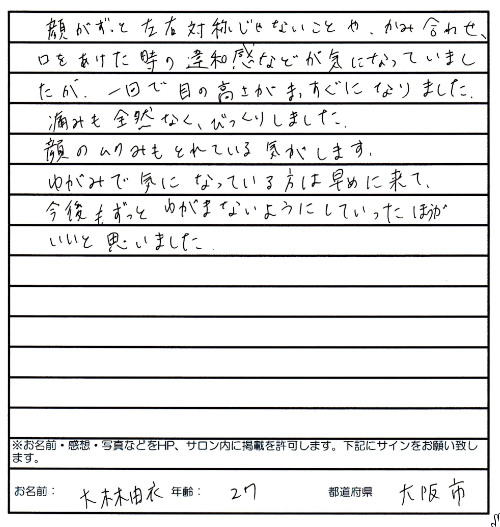 普段、あまりゆがみは気にしていませんでしたが、施術後の左右対称の写真をみると、全然いつもと印象が違っていて、もっと早く受けたらよかったと思いました。